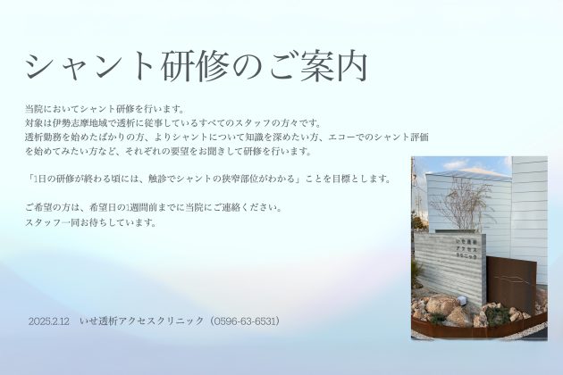 お知らせ 短期滞在手術等基本料1の施設基準取得について 2025.02.26 お知らせ シャント研修のご案内 2025.02.01 お知らせ ウェブサイト公開しました 2024.12.08 お知らせ 2024年冬開院予定 2024.07.23